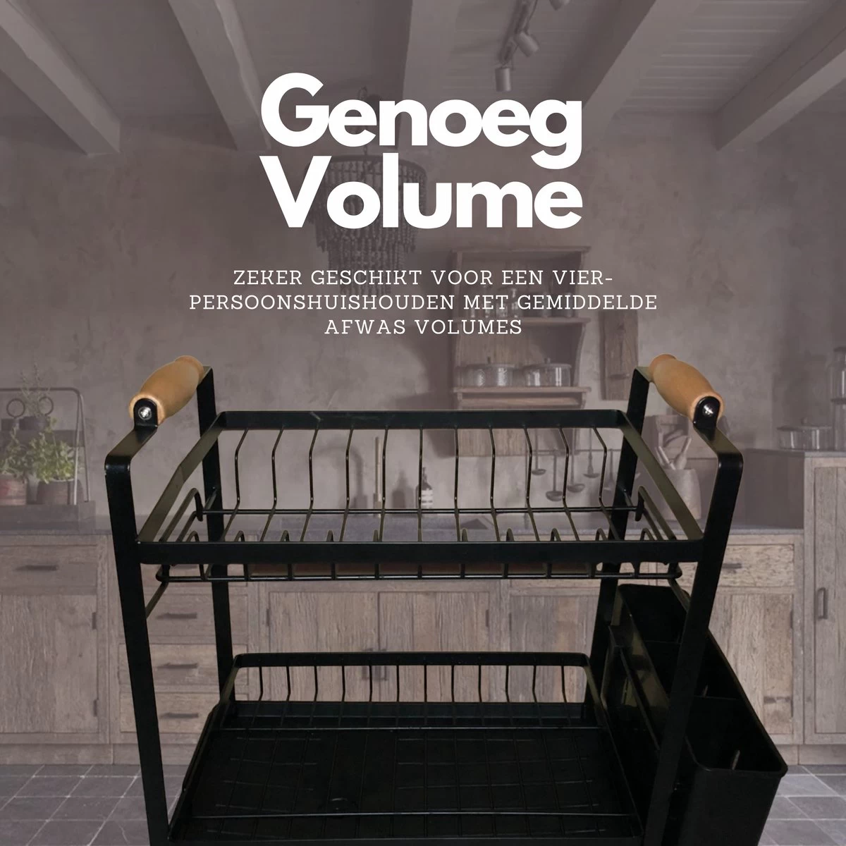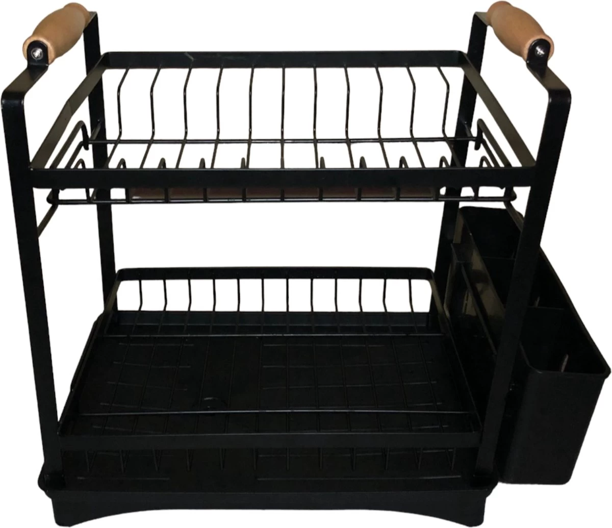 Dit afdruiprek maakt afwassen een stuk aangenamer en is een complete set voor alle soorten servies, pannen en bestek. Het ontwerp is gemaakt van roestvrij staal (RVS) en is voorzien van een bestekbak, houten handvaten en een bordenrek. Het is zelfs geschikt voor grote of hoge glazen en mokken.