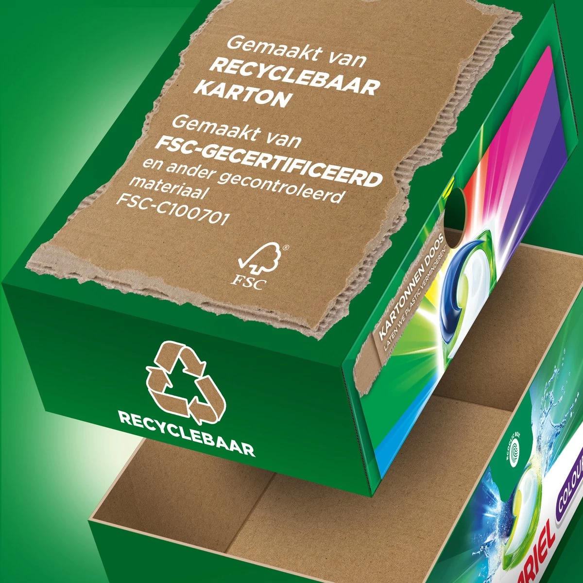 - Ecoclic kartonnen doos: Zorg voor minder plastic met Ariel All-in-1 PODS-wastabletten, nu in een recyclebare kartonnen doos die gemaakt is met 70% gerecyclede vezels en maximaal 5% plastic, ontworpen om je pods te beschermen