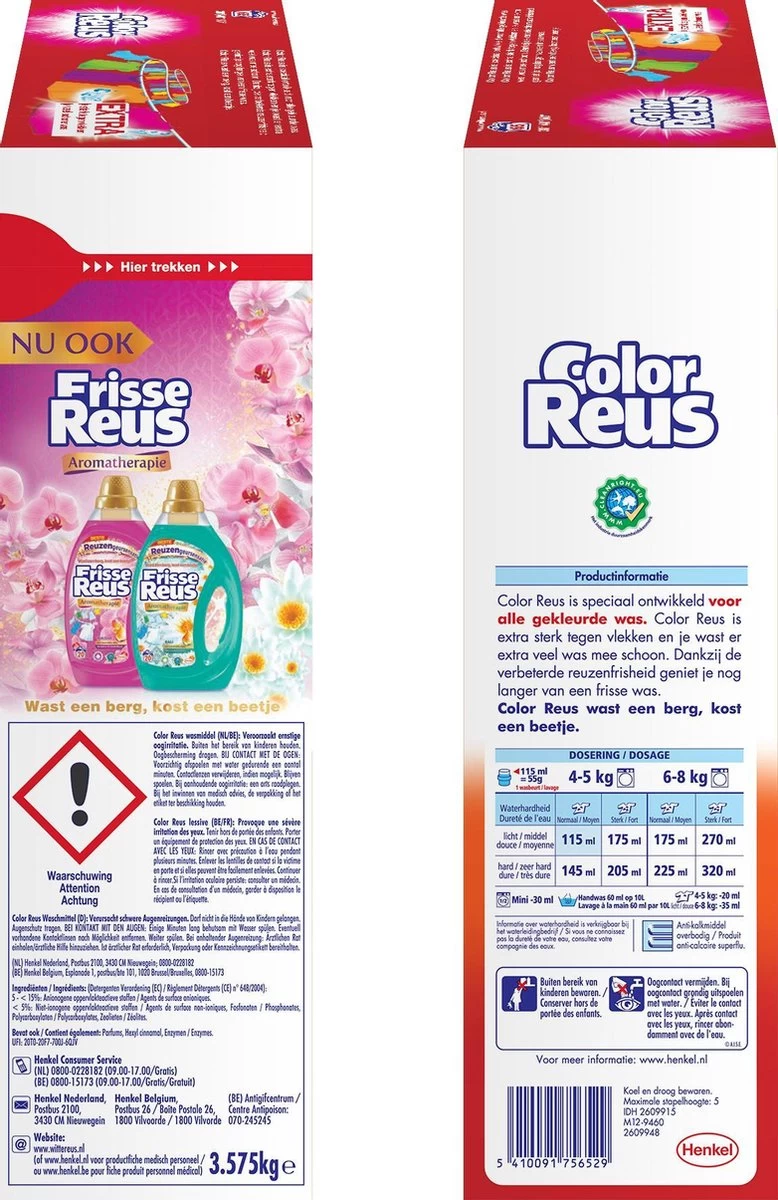 Color Reus is een waspoeder van Witte Reus speciaal ontwikkeld voor alle gekleurde was. De formule van Color Reus beschermt kleuren en laat ze langer stralen.