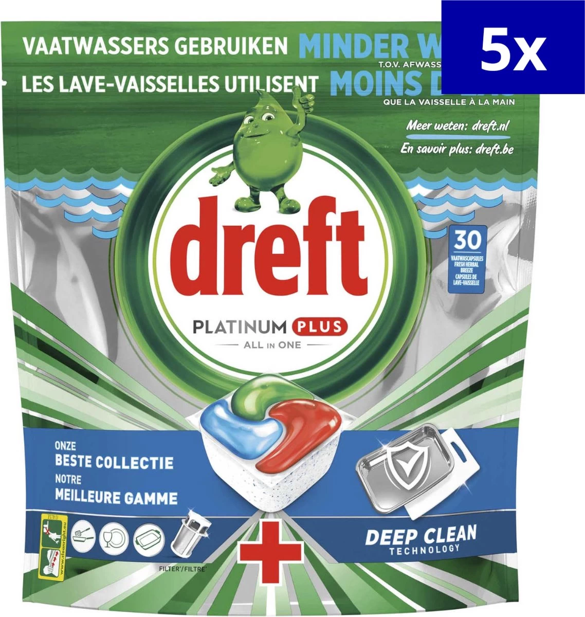 Dreft Platinum Plus All-in-One 150 Stuks (5 X 30 Vaatwastabletten) – Voordeelverpakking