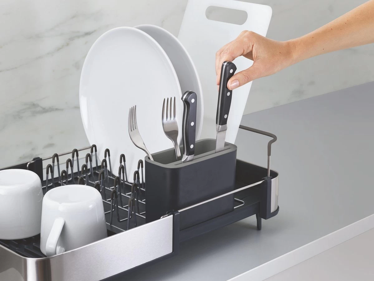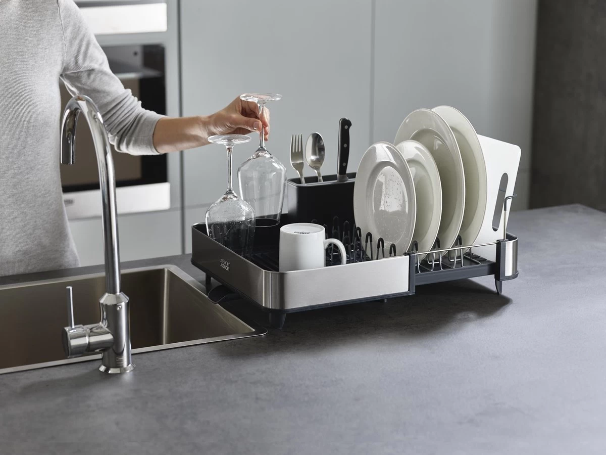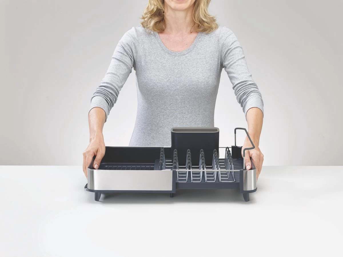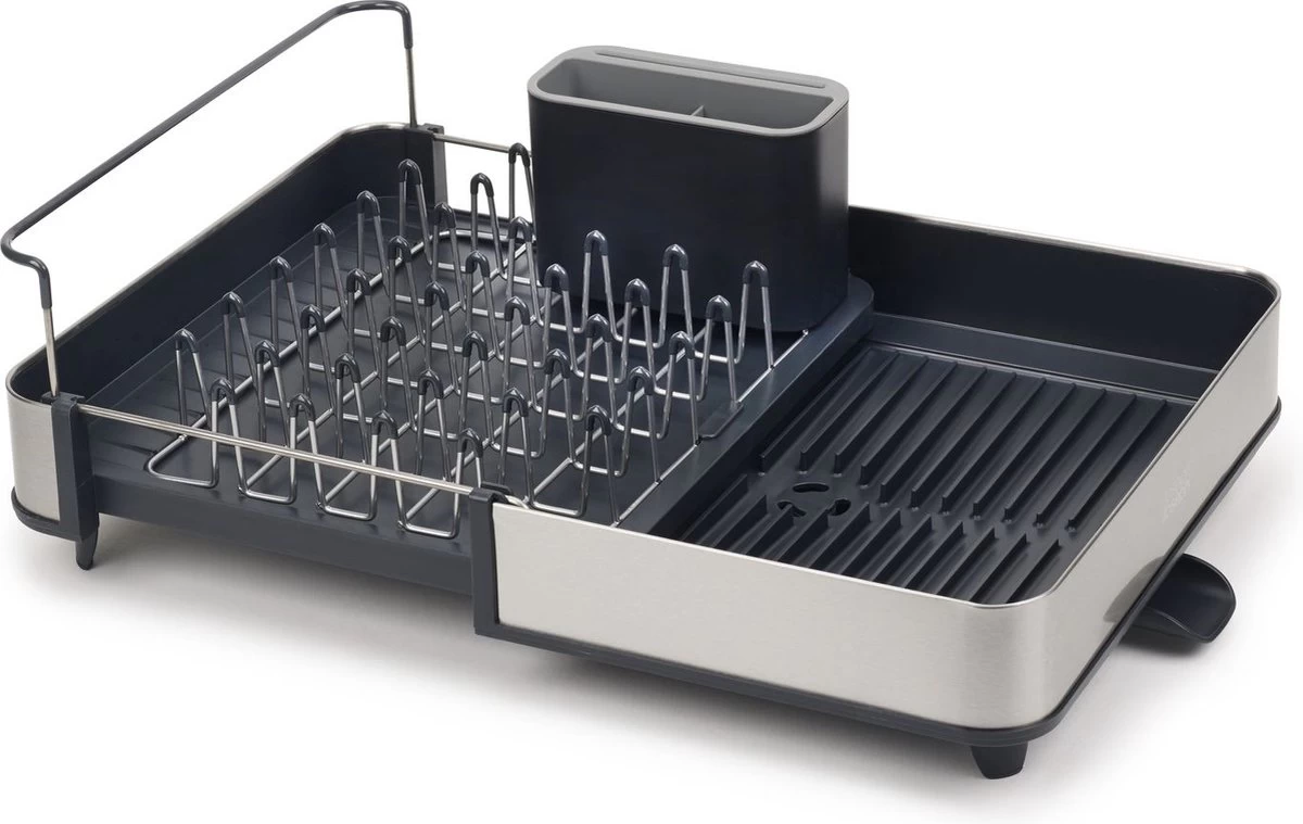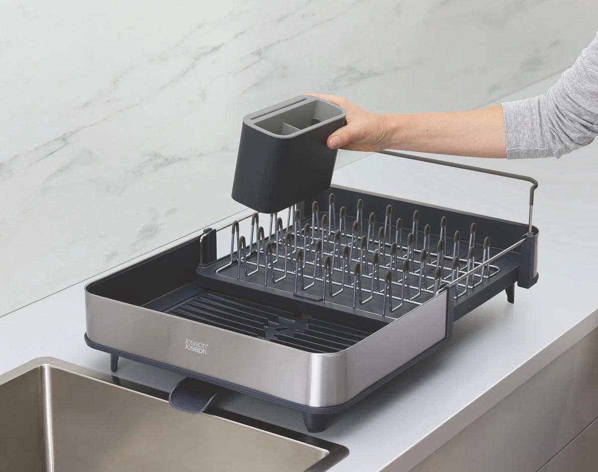 Dit handige Extend Steel afdruiprek van Joseph Joseph is ideaal voor zowel kleinere als grotere huishoudens, omdat hij uitschuifbaar is. Afhankelijk van de ruimte die je tot je beschikking hebt, kun je hem zo ver uitschuiven als nodig is. Het stalen rek is ideaal voor je glazen, mokken en borden en bevatten een speciale beschermende laag tegen het krassen. De basis van het afdruiprek is voorzien van ribbels zodat het water niet vast blijft zitten onder de vaat. Ook zorgt het ervoor dat het water naar een gootje wordt geleid waardoor het water zo weer de wasbak in druppelt. Dit gootje is, afhankelijk van de ruimte, heel gemakkelijk in 3 verschillende posities te draaien. Het afdruiprek bevat verder ook nog een bestekbak met speciale sleuven om scherpe messen in te zetten.