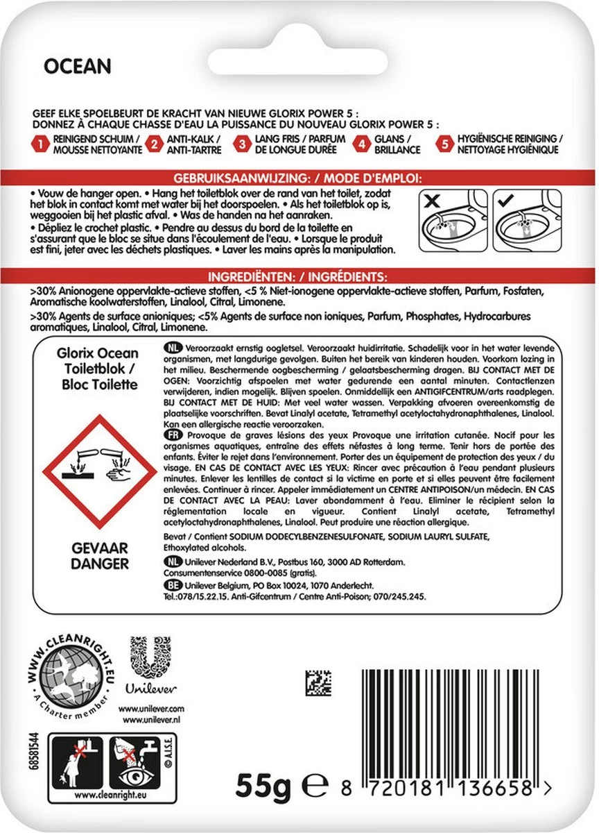 Het Glorix Ocean WC Blok geeft elke spoelbeurt de kracht van de Glorix Power 5, tot wel 300 spoelbeurten lang. Het product heeft diverse voordelen! Het reinigend schuim met anti-kalk werking houdt je toilet lang fris en zorgt bovendien voor glans en een hygiënische reiniging. Zo geniet jij dagelijks van een schoon toilet. De hanger is bovendien 100% recyclebaar! Gebruiksaanwijzing: – Vouw de hanger open. – Hang het toiletblok over de rand van het toilet, zodat het blok in contact komt met water bij het doorspoelen. – Als het toiletblok op is, weggooien in de vuilnisbak. – Was de handen na het aanraken.