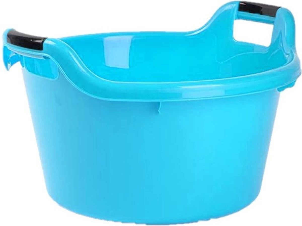 Grote kunststof teiltje/afwasbak/huishoud teil rond met stevige handvatten van 17 liter in het blauw. Handige camping/badkamer wasmand bak voor afwassen/handwas/weken/voeten/opslag/troep etc. Afmetingen: 45 x 42 x 27 cm. Onmisbaar bij de schoonmaak in elk huishouden.