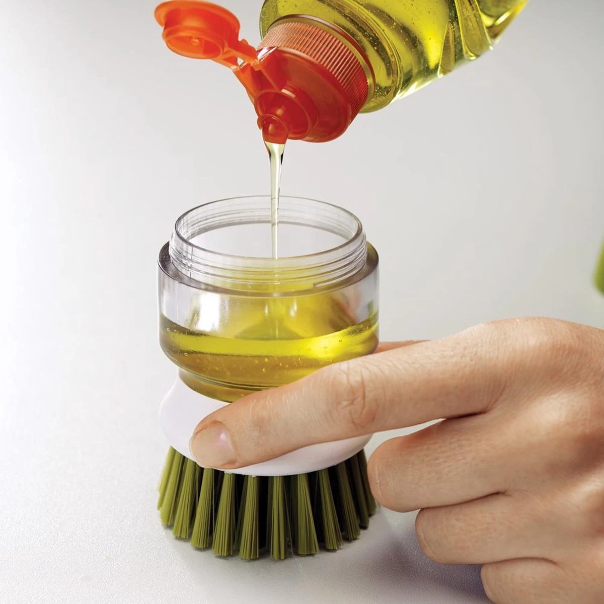 Deze innovatieve Palm Scrub afwasborstel van Joseph Joseph is ideaal voor het reinigen van pannen en servies. De afwasborstel is niet zo maar een afwasborstel, want deze is bevestigd op een handige zeepdispenser die u kunt vullen met afwasmiddel. Met 1 druk op de knop komt het afwasmiddel uit de dispenser via de afwasborstel, waardoor u servies en pannen eenvoudig kunt reinigen. Het afwassen van uw servies in een sopje is dus verleden tijd! Dit werkt niet alleen prettig, maar is ook hygiënisch. U hoeft servies en pannen nu nooit meer te reinigen in water dat al vervuild is. De afwasborstel heeft anti-kras borstelharen, waardoor u deze ook prima kunt gebruiken in pannen met een anti-aanbaklaag. De afwasborstel wordt bovendien geleverd met een handige houder. De houder vangt overtollig water en zeep, afkomstig uit de afwasborstel, eenvoudig op in het reservoir. U kunt de houder eenvoudig uit elkaar halen om het overtollige water en zeep weg te gooien. Daarna kunt u de houder eenvoudig reinigen in de vaatwasmachine. Hierdoor kunt u hygiënisch werken.