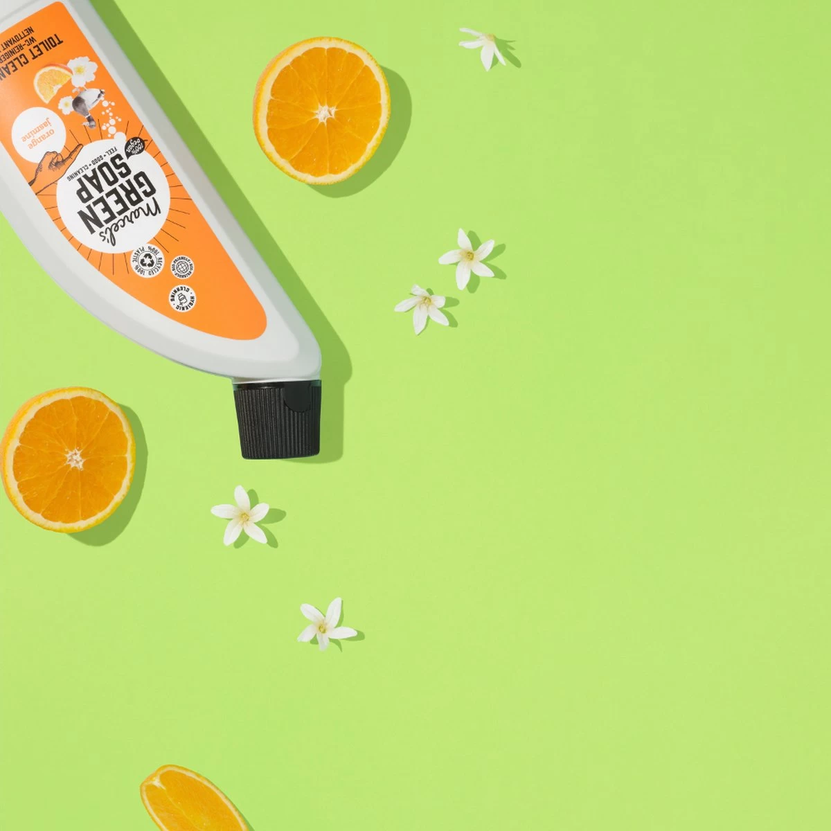 Marcel’s Green Soap toiletreiniger sinaasappel & jasmijn is gemaakt met natuurlijke ingrediënten, minstens 97% biologisch afbreekbaar en komt in een fles van 100% gerecycled plastic. Lekker duurzaam de pot op je zou ‘m bijna over het hoofd zien omdat ‘ie zo klein is – maar ook op het kleinste kamertje in huis valt winst te behalen. Veel reguliere schoonmaakmiddelen zoals toiletreiniger bevatten namelijk schadelijke stoffen voor het milieu. Daarnaast leveren ze ook nog eens een berg afval op. Niet nodig. Kies daarom voor de duurzame toiletreiniger en het duurzame toiletblok van marcel’s green soap, en maak van het kleinste kamertje in huis ook het groenste kamertje! duurzame toiletreiniger zoals alle producten van marcel’s green soap, bevat onze toiletreiniger geen kleurstoffen, parabenen, fosfaten, chloor, ammonia of zuren. Wél zit ‘ie bomvol natuurlijke ingrediënten, en is de toiletreiniger minstens 97% biologisch afbreekbaar. Hiermee is de toiletreiniger veilig te gebruiken, ook wanneer je een septic tank hebt. Sinaasappel & jasmijn jasmijn heeft een mysterieuze, bedwelmende toon, en schijnt ook een romantisch afrodisiacum te zijn. Als dat jouw relatie met schoonmaken niet versterkt! gelukkig voegt de sinaasappel hier de nodige nuchterheid en frisheid aan toe. We zijn hier tenslotte wel om schoon te maken…