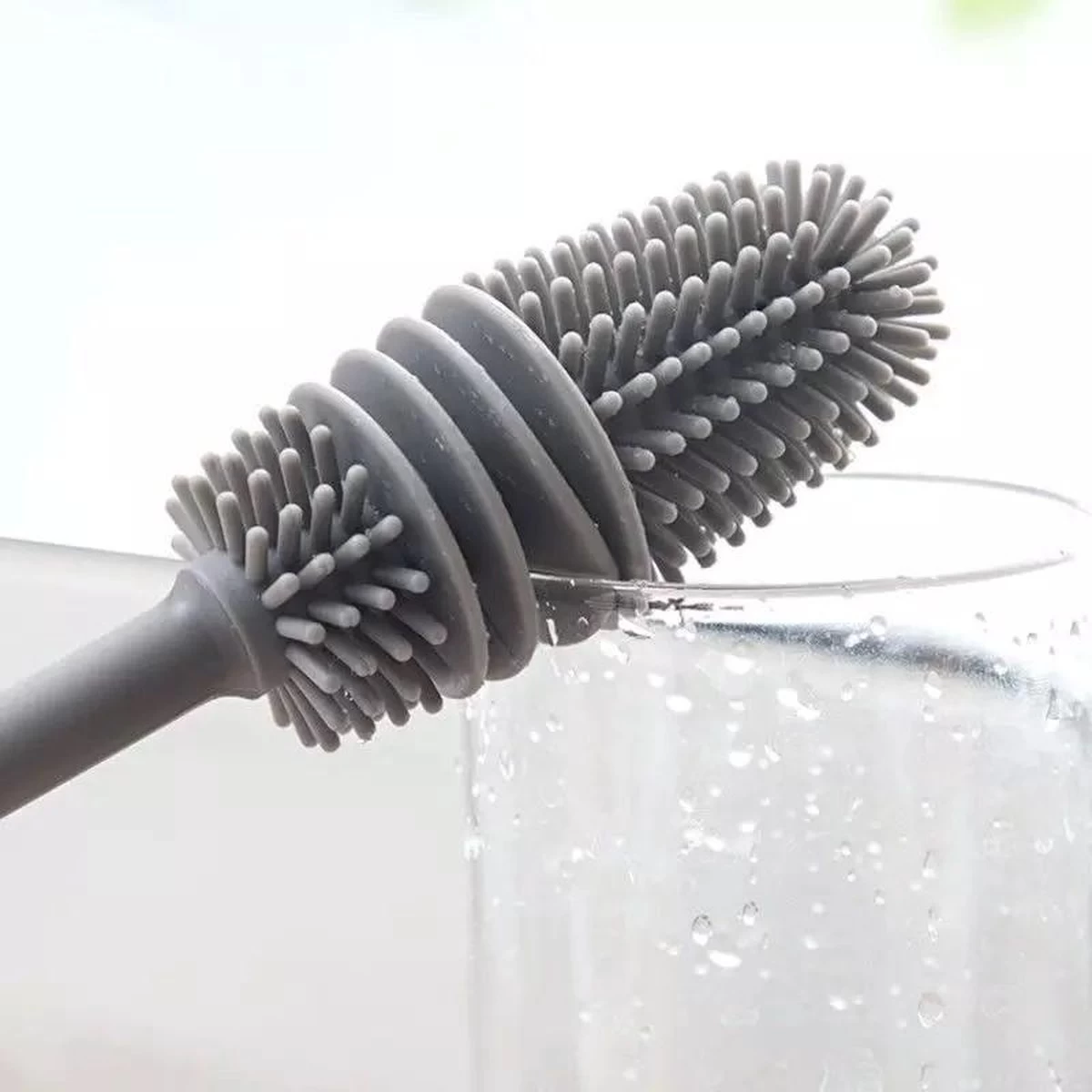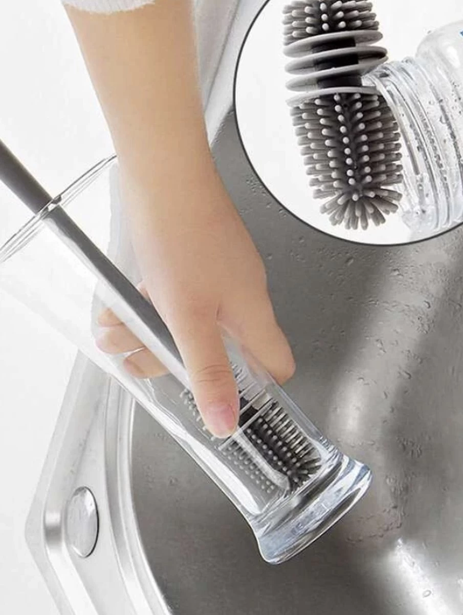 Met deze grijze siliconen afwasborstel kun je makkelijk de lange glazen schoonmaken.