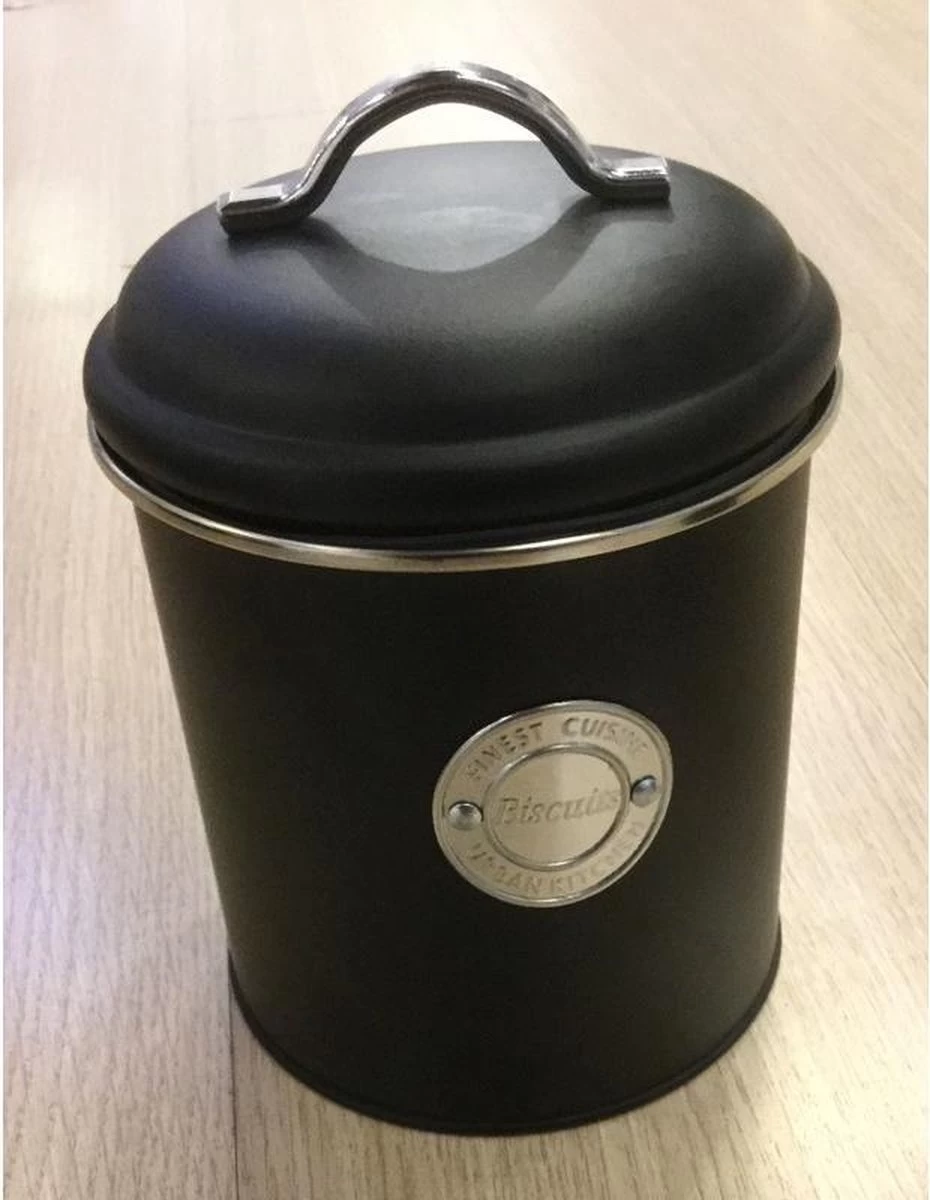 Zwarte koektrommel/koekblik/voorraadblik, met de tekst Biscuits. Afmeting: D13 x H18 cm. Inhoud: ca. 1,5 liter. Materiaal: metaal. Koekjes bewaren – Koektrommels/voorraadblikken – Keukenbenodigdheden.