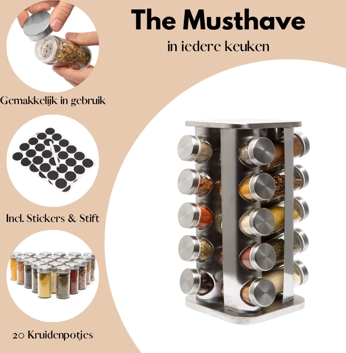 Geen overvolle lades of kasten meer door dat overal kruiden en specerijen staan maar een overzichtelijk en opgeruimde keuken door het gebruik maken van onze kruidencarrousel. Door de 20 bijgeleverde glazen potjes kun jij jouw favoriete kruiden en specerijen kwijt in het kruidenrek en ruimte besparen in de keuken. Een stijlvolle en moderne uitstraling waarbij het de carrousel uitstekend past in elke keuken.