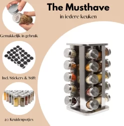 Pazzo Goods – Kruidenrek Staand – Kruidenrek Met Potjes – Zilver – RVS – Kruidenrek Draaibaar – 20 Kruidenpotjes – Inclusief Stickers & Stift – Kruiden Carrousel