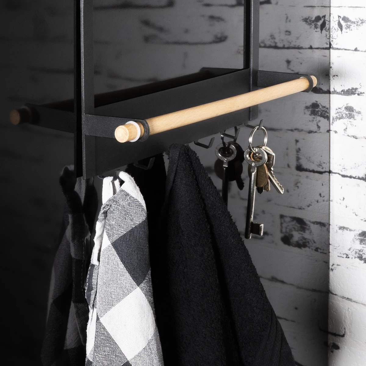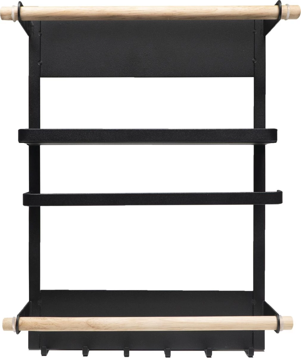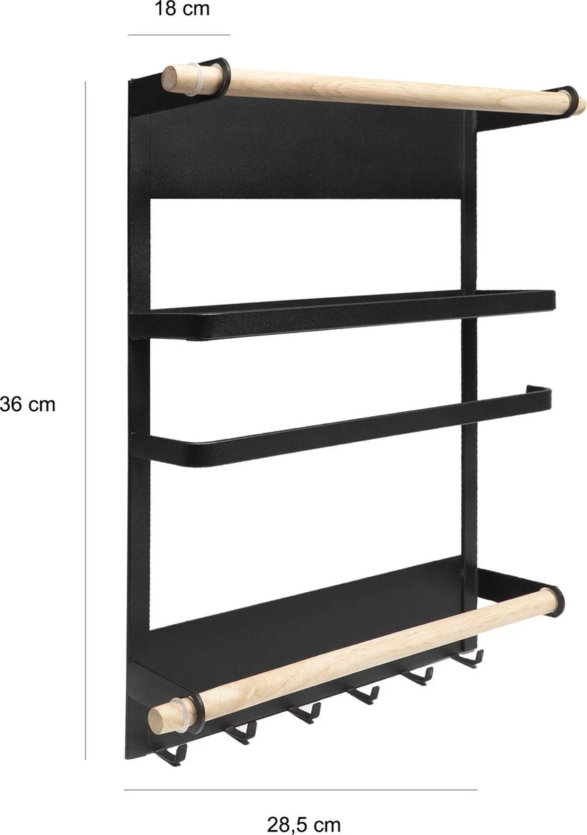 Het keukenrek in het zwart met magneetstrip is 35 cm hoog, 28.5 cm breed en 7,5 cm diep. Het plateau waar potjes opgezet kunnen worden meet 5,5 x 24 cm (lxb). Hij past daardoor op (bijna) elke koelkast,maar is natuurlijk ook te bevestigen aan alle magnetische oppervlakten. Bovenaan het rekje is een houten stang om wat aan te hangen of bijvoorbeeld een bord achter te zetten. Dat bord kan dan ondersteund worden door het metalen plankje eronder. Onder het plankje bevind zich een metalen stang,met een opening aan de zijkant. Vervolgens is er weer een houten stang. Helemaal onderaan zijn ook nog een aantal metalen haakjes te vinden,hier kunnen handdoeken aan opgehangen worden.