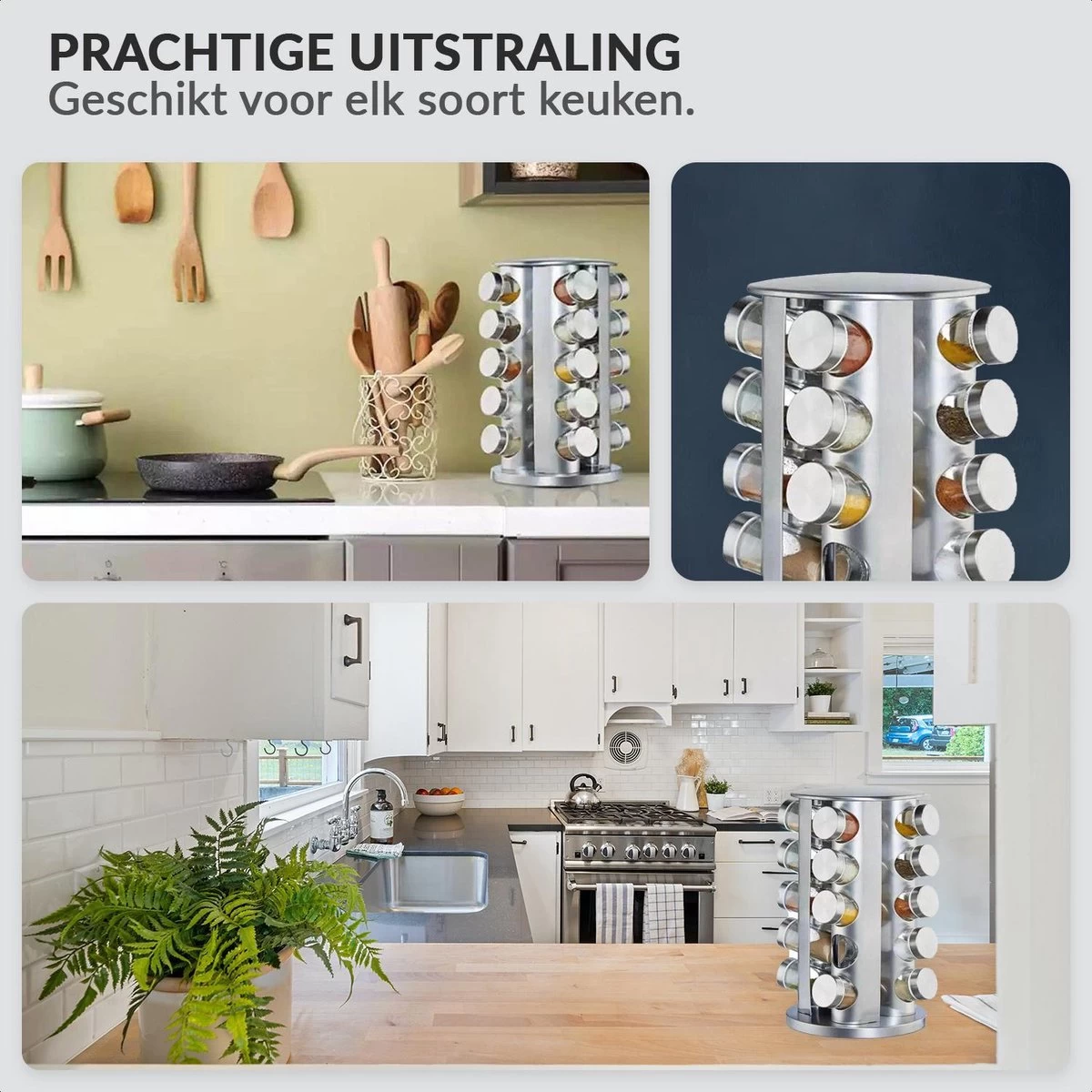 Het is afgelopen met de chaos in het keukenkastje. De moderne kruidencarrousel van roestvrij staal zorgt voor orde op het aanrecht. 20 glazen potjes voor het bewaren van al je kruiden zoals curry, paprikapoeder en zout. Onder het kruidenrekje is een kunststof schijf gemonteerd die het mogelijk maakt het rek te draaien. Zo kom je heel makkelijk bij al je kruidenpotjes. De glazen potjes zijn verdeeld over 5 etages en kunnen dankzij de strooigaatjes direct als strooipotjes worden gebruikt.